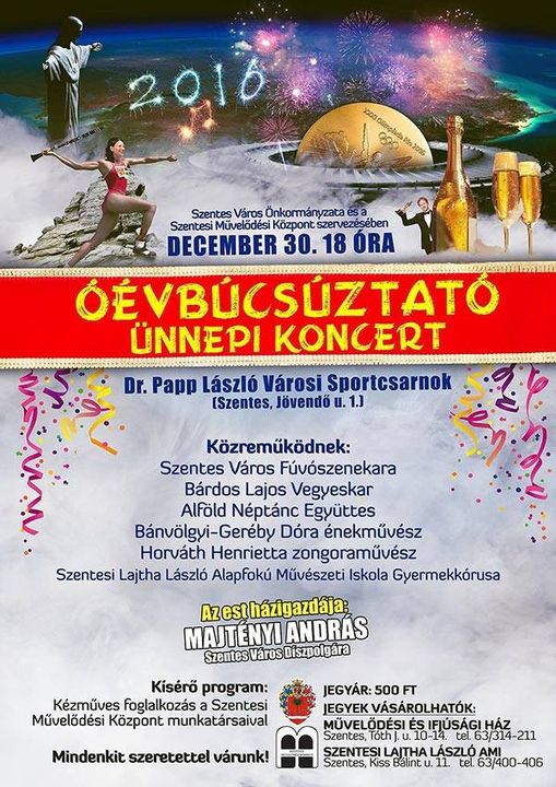 Az év utolsó előtti napján ünnepi koncerten búcsúztatjuk az óévet a Dr. Papp László Városi Sportcsarnokban, melyre várnak minden érdeklődőt. További részletek a plakáton!