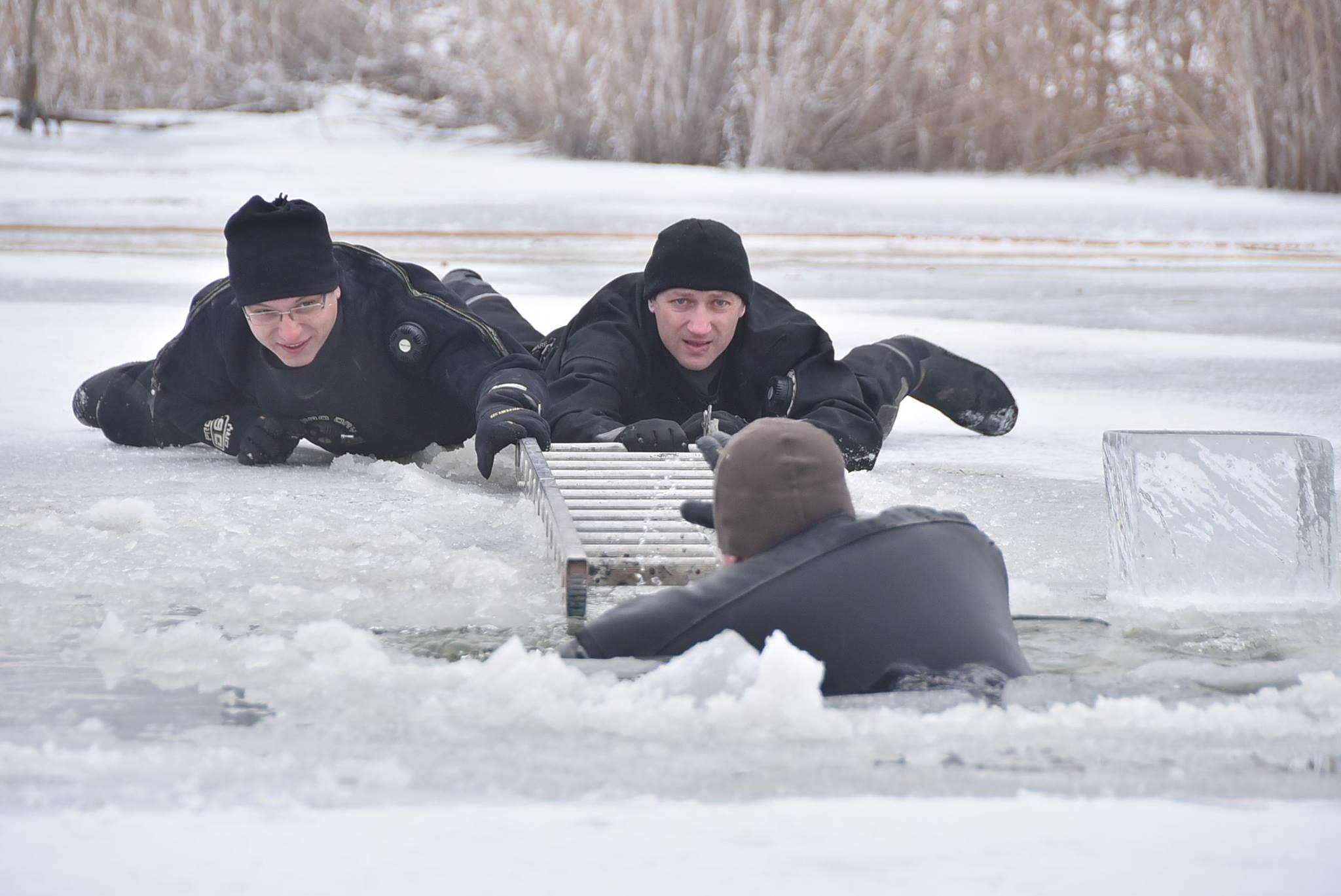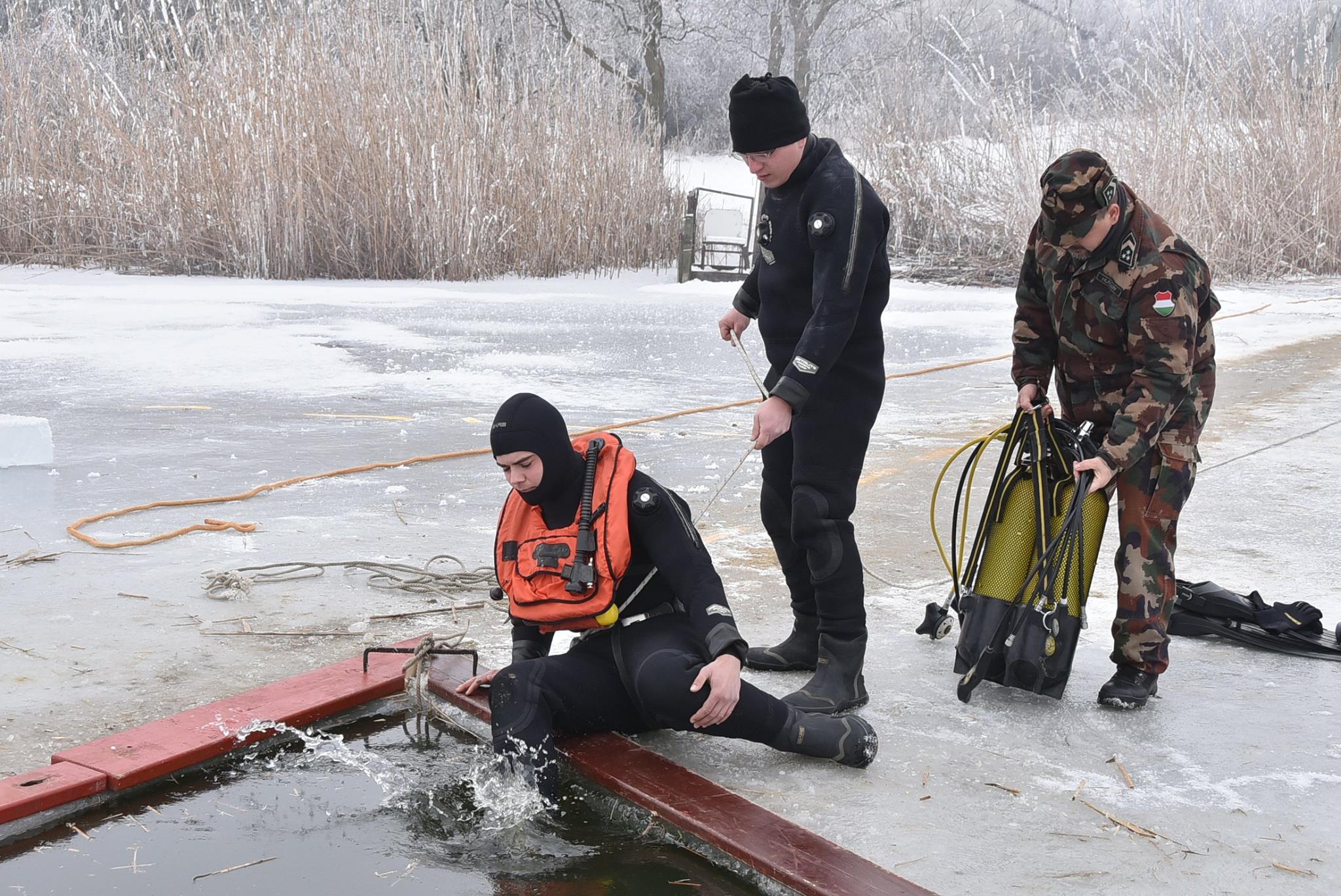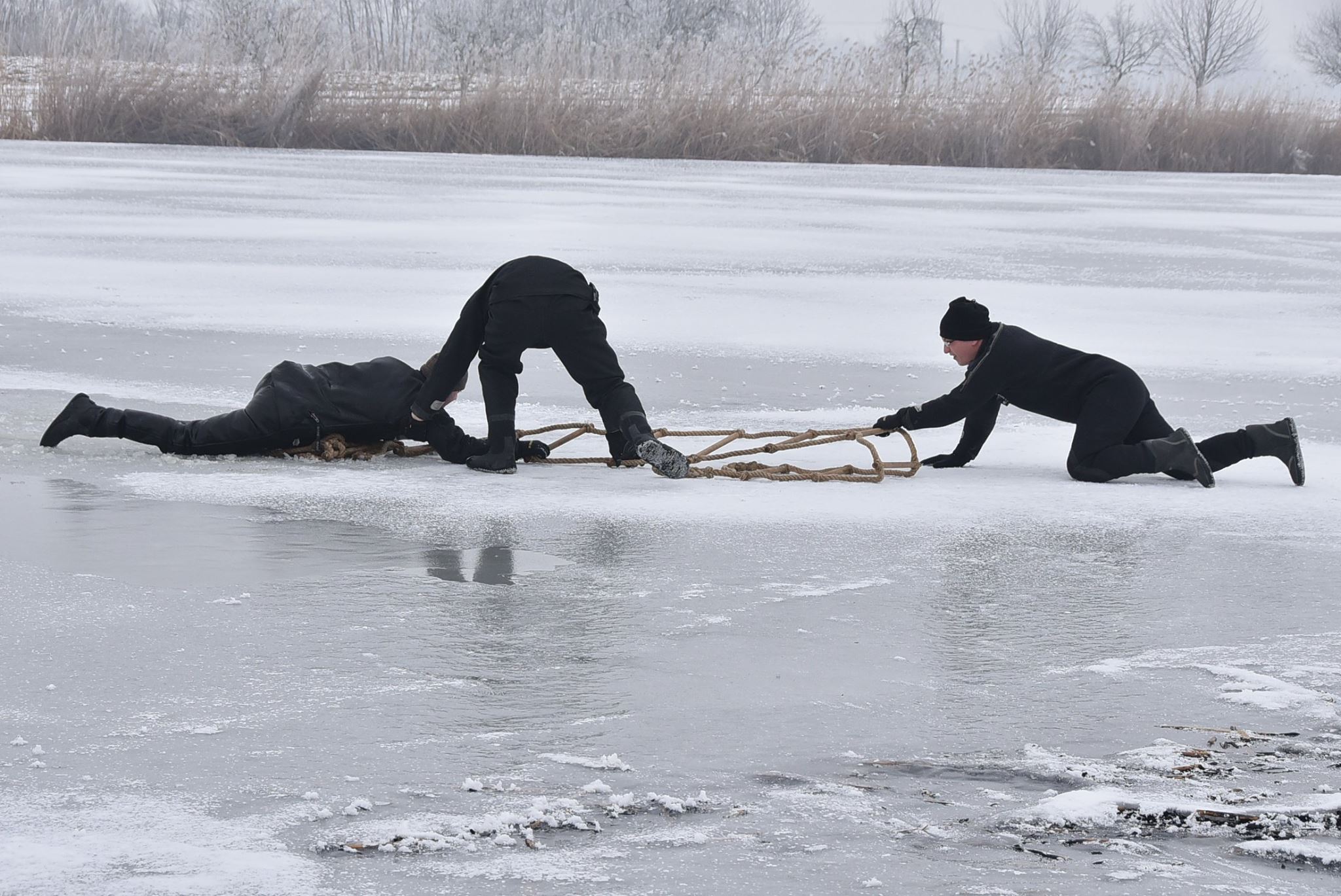 A gyakorlat első részében egy lékbe beszakadt ember kihúzását gyakorolták. Először kötél- majd alumínium létrával kísérelték meg a bajbajutottat kimenteni.