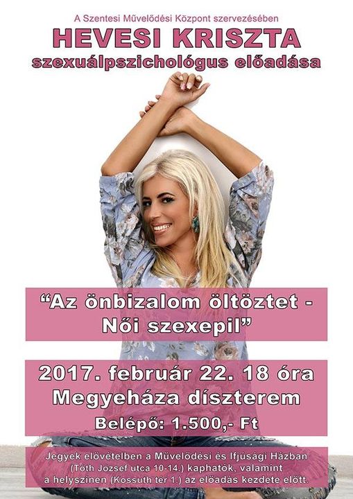 A Szentesi Művelődési Központ szervezésében 2017. február 22-én (szerdán) 18 órai kezdettel sok szeretettel várjuk a kedves érdeklődőket a Megyeháza Konferencia és Kulturális Központba, ahol Hevesi Kriszta szexuálpszichológus előadását hallgathatják meg! Az előadás címe: „”!