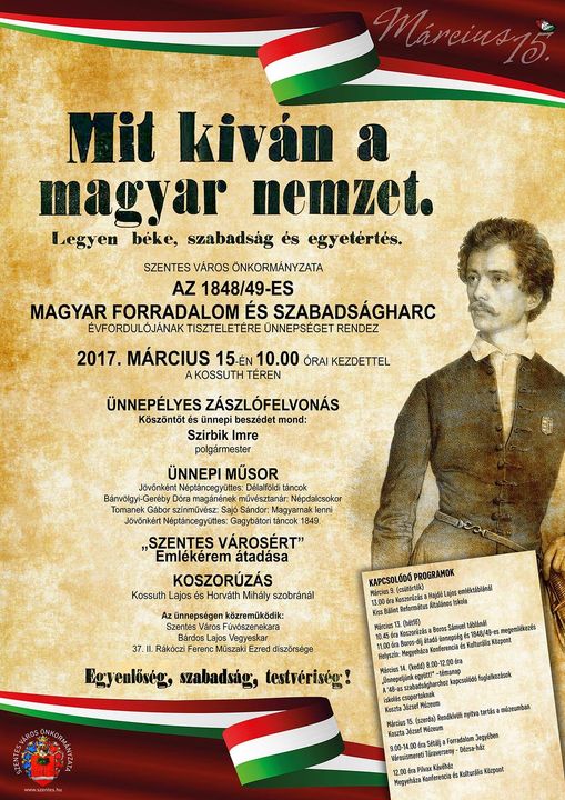 Szentes Város Önkormányzata tisztelettel meghívja Önt és családját 2017. március 15-én az 1848/49-es magyar forradalom és szabadságharc évfordulójának tiszteletére rendezett ünnepségre.