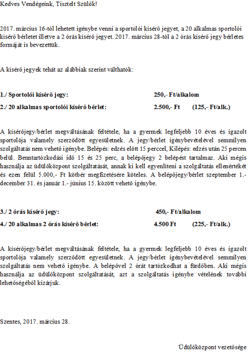 A Szentesi Sport- és Üdülőközpont ügyvezetőjének sajtónyilatkozata a kísérő jegyekkel és bérletekkel kapcsolatban: