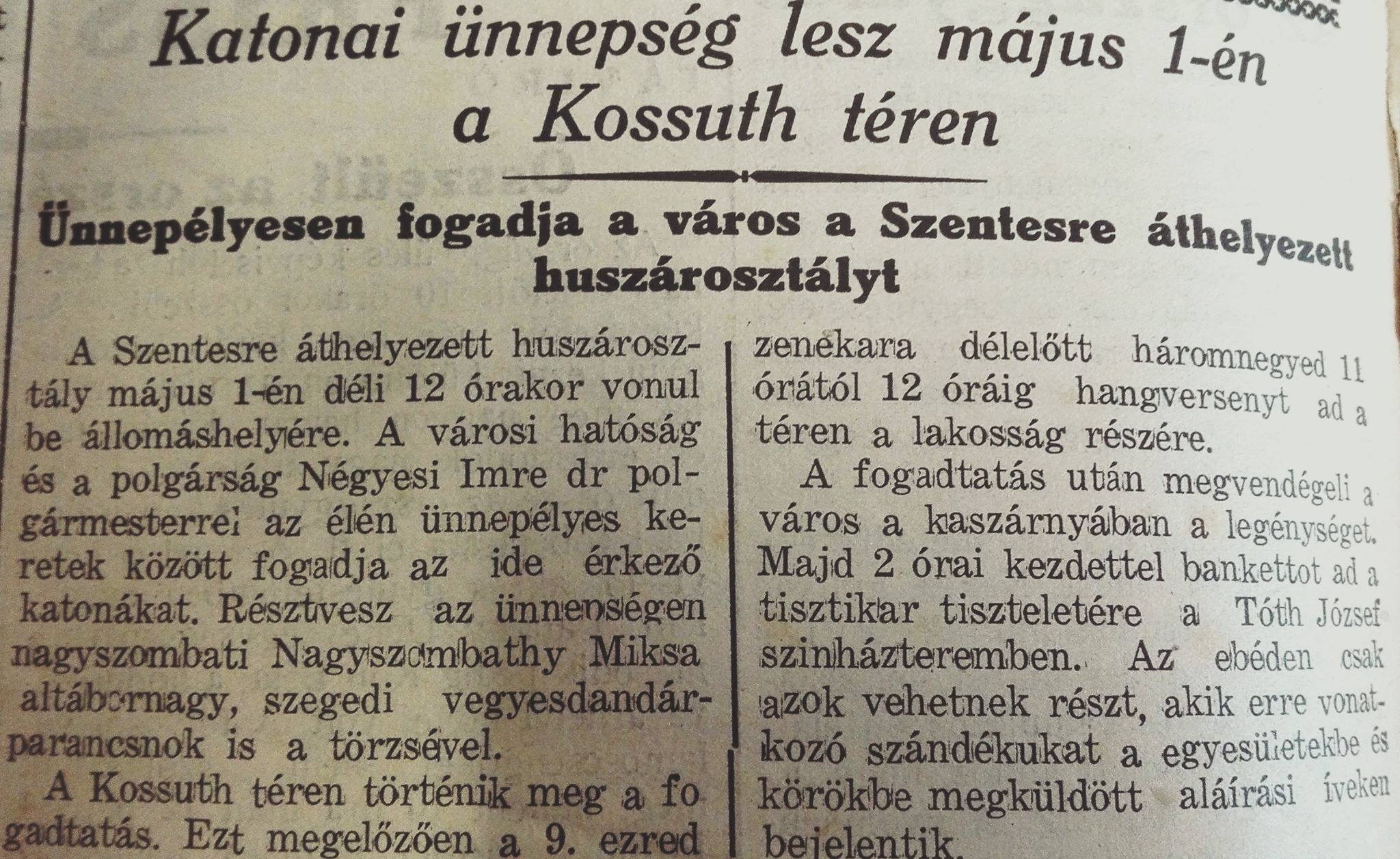 1935. május 01-én érkezett meg első katonai alakulatként helyőrségünkbe a 2/I huszárosztály Komárom városából. Szentes lakossága nagy örömmel és ünnepséggel fogadta a vitéz szakácsi Csorba József huszár alezredes által vezetett huszárokat.