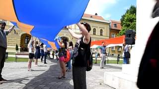 Szentes – 250 méter hosszú székely, illetve magyar zászlót hoztak magukkal azok a sepsiszentgyörgyi diákok, akik a HMG drámatagozatának meghívására érkeztek a városba.