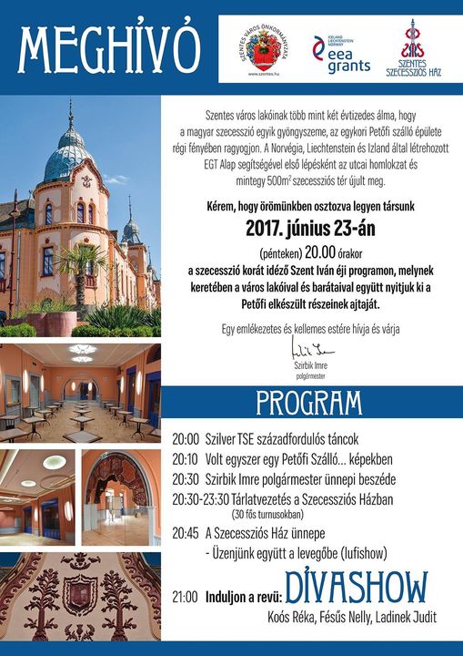 2017. június 23-án (pénteken) 20.00 órakor a szecesszió korát idéző Szent Iván éji programon kerül mindez átadásra egy emlékezetes est keretében. Jöjjön el Ön is, várjuk családjával hozzátartozóival az éjfélig tartó megtekintésre.