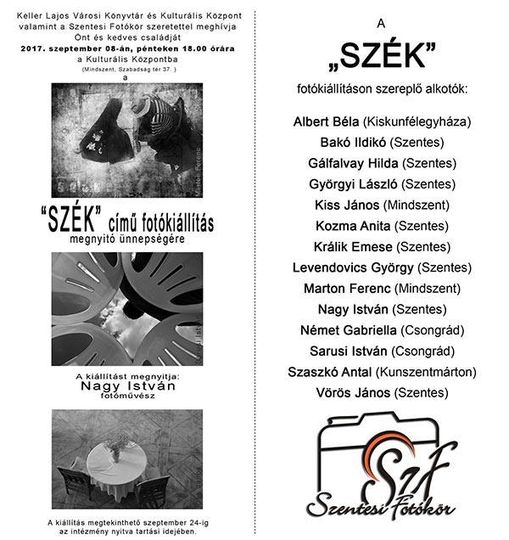 A szentesi alkotócsoport már 2009-ben és 2015-ben is kapott meghívást Mindszentről. A most bemutatott kollekció korábban nagy sikert aratott a lengyelországi Łódz városában és Újvidéken is. Természetesen a „szék” nem mint ülőbútor jelenik meg a képeken, hanem a fotós, az alkotó továbbgondolja azt. Próbál valamit kifejezni a „szék” által, sugallni egyfajta érzelmi állapotot, hangulatot, érzelmi feltöltődést, mondandó múlandót, de mégis örökérvényűt az utókor, a néző, a befogadó számára, ahol tehát a szék kifejező eszköz. Fontos lehet ezen ülőalkalmatosság formája, alkotóelemeinek végtelen sok variációja, és ezáltal egyfajta ritmust hozva létre a kiállításon látható 40 kép segítségével. A külföldi visszajelzésekből is kiderült: a fotográfiát kedvelő közönség szereti a szentesiek olykor meghökkentő, humoros, sokszor rendhagyó látásmóddal készült alkotásait.