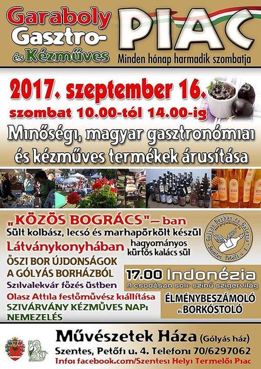 Ha a hónap 3. szombatja, akkor Gasztro Piac, ami éppen most lesz 50. alkalommal!!! Ha szeptember, akkor rotyog az üstben a magyar konyha kihagyhatatlan kincse, a szilvalekvár. A szombati piacon immár hagyományosan egy termelő egész üsttel főz, amit helyben azon melegében bárki megkóstolhat és megvásárolhat. Akinek van kedve és ideje (reggel 6 órától délután 2-3 óráig) végignézheti és megtanulhatja hogyan készül a Bartha Edit-féle igazi minőségi termelői szilvalekvár. Ami hazai és garantáltan 100% gyümölcs. Akik inkább szellemi termékekre vágynak, az ő kényeztetésükről Olasz Attila festőművész gondoskodik. A piac ideje alatt az ő festményeiből készült kiállítást is megtekinthetik látogatók.