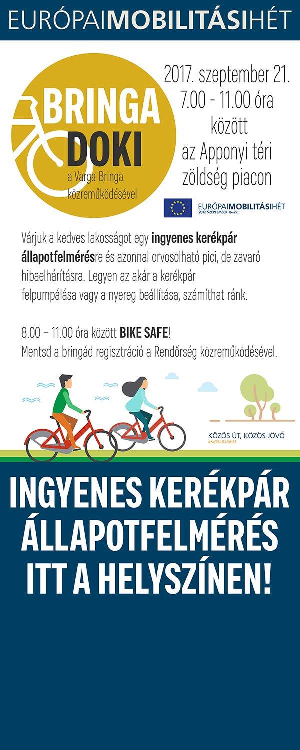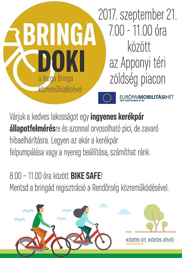 Az Európai Mobilitási Hét keretében 2017. szeptember 21-én BRINGA DOKI várja a pácienseket az Apponyi téri piacra, ahol kisebb javításokat elvégez. Legyen az akár a kerékpár felpumpálása vagy a nyereg beállítása, számíthat rá.