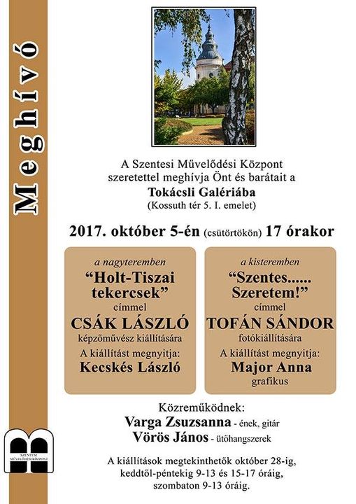 A Szentesi Művelődési Központ szeretettel meghívja Önt és barátait a Tokácsli Galériába (Kossuth tér 5. I. emelet) 2017. október 5-én (csütörtökön) 17 órakor a nagyteremben „Holt-Tiszai tekercsek” címmel CSÁK LÁSZLÓ képzőművész kiállítására, a kisteremben „Szentes…… Szeretem!” címmel TOFÁN SÁNDOR fotókiállítására .