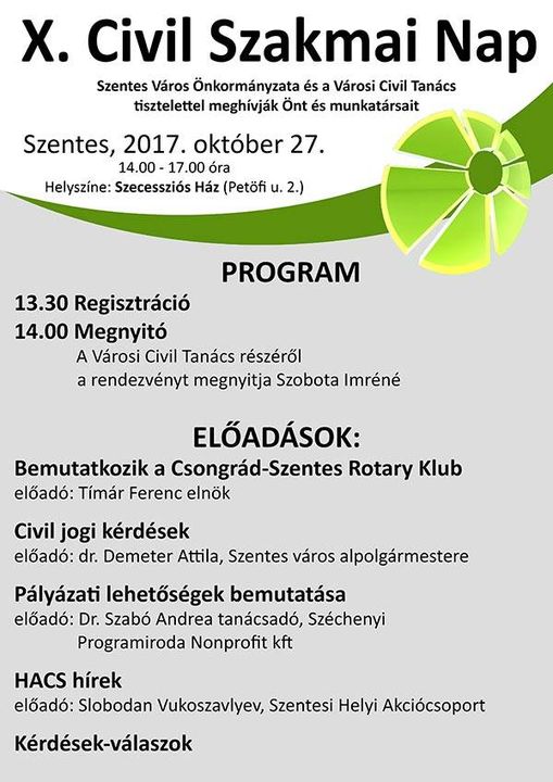 Szentes Város Önkormányzata és a Városi Civil Tanács tisztelettel meghívják Önt és munkatársait a X. Civil Szakmai Nap programjaira.