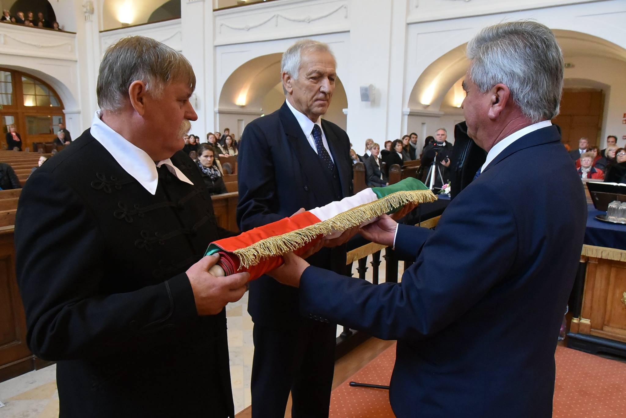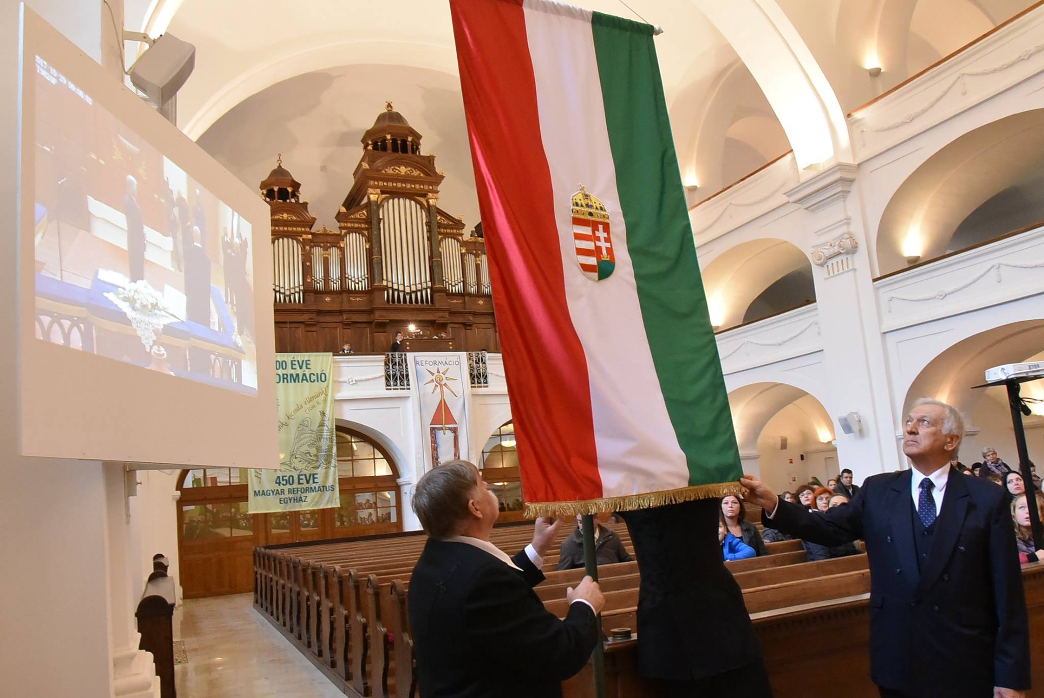 Farkas Sándor országgyűlési képviselő a jubileum alkalmából Országzászlót adott át a gyülekezetnek.