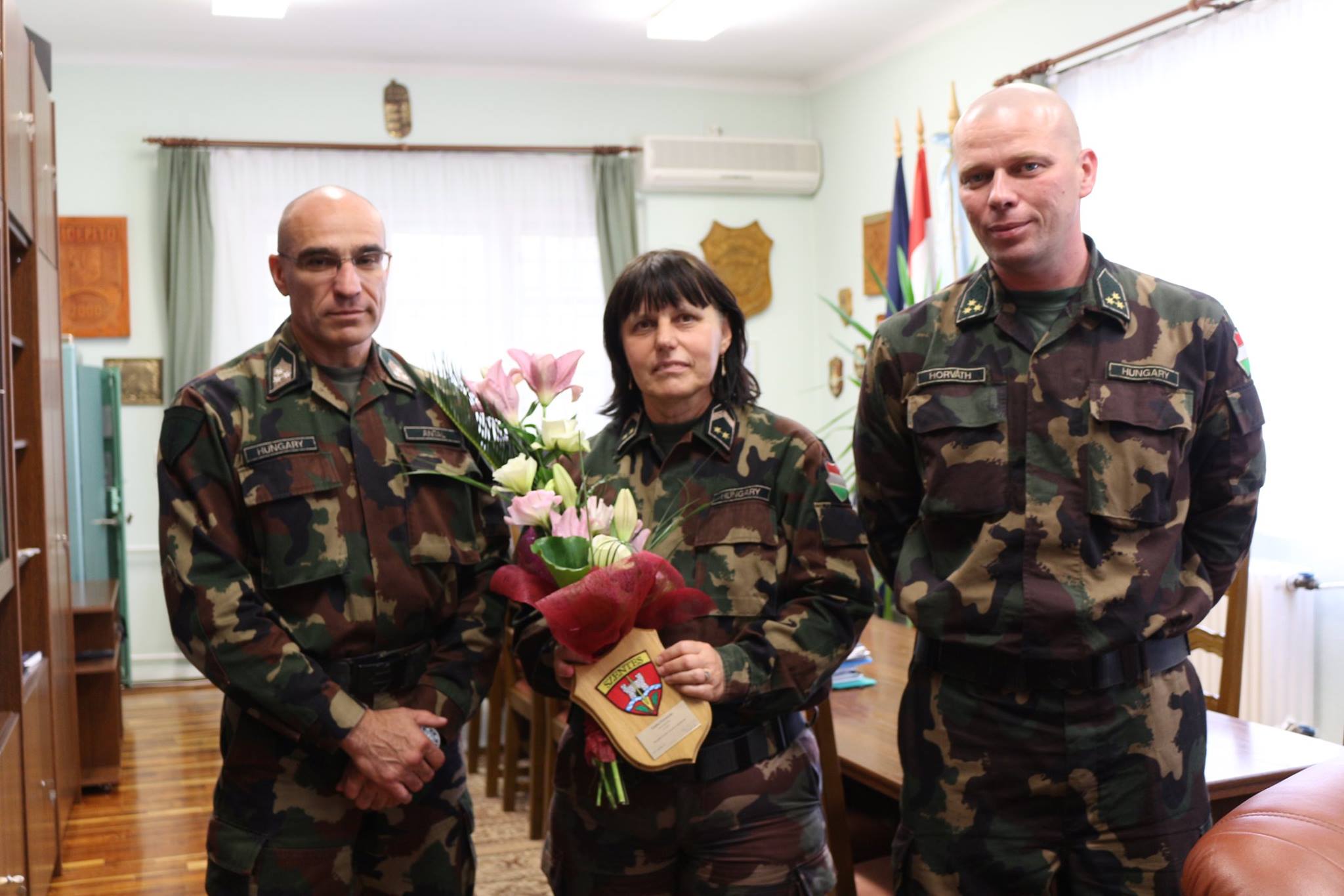 Szabó Ferencné törzszászlóst köszöntötte ma Antal László ezredes, a műszaki ezred parancsnoka, abból az alkalomból, hogy negyven dolgos év után nyugállományba vonult.