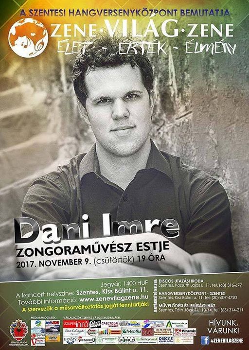 Egy nagyon fiatal és nagyon tehetséges zongoraművész, Dani Imre ad önálló koncertet, aki a csongrádi zeneiskola (tanára: Kocsis Csaba) után Szentesen Nagy János növendékeként nagy szorgalmával, tehetségével, de végtelen szerénységével már gyerekként kitűnt társai közül. Kétszer is 1. helyen végzett az Országos Szolfézsversenyen Debrecenben. Emlékszem, kamasz fiúként szinte szótlan volt, minden mondanivalóját a zongorázása fejezte ki.
