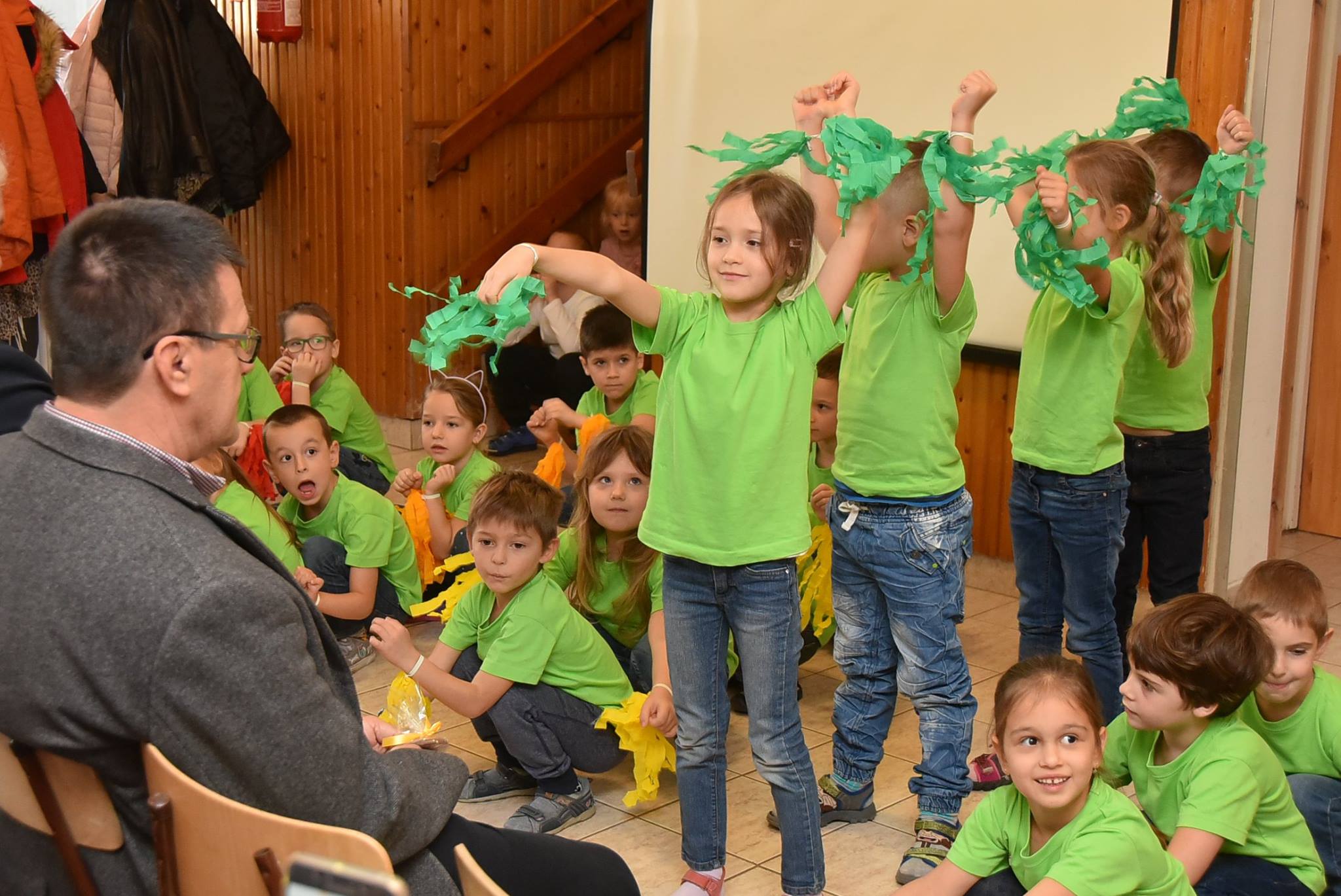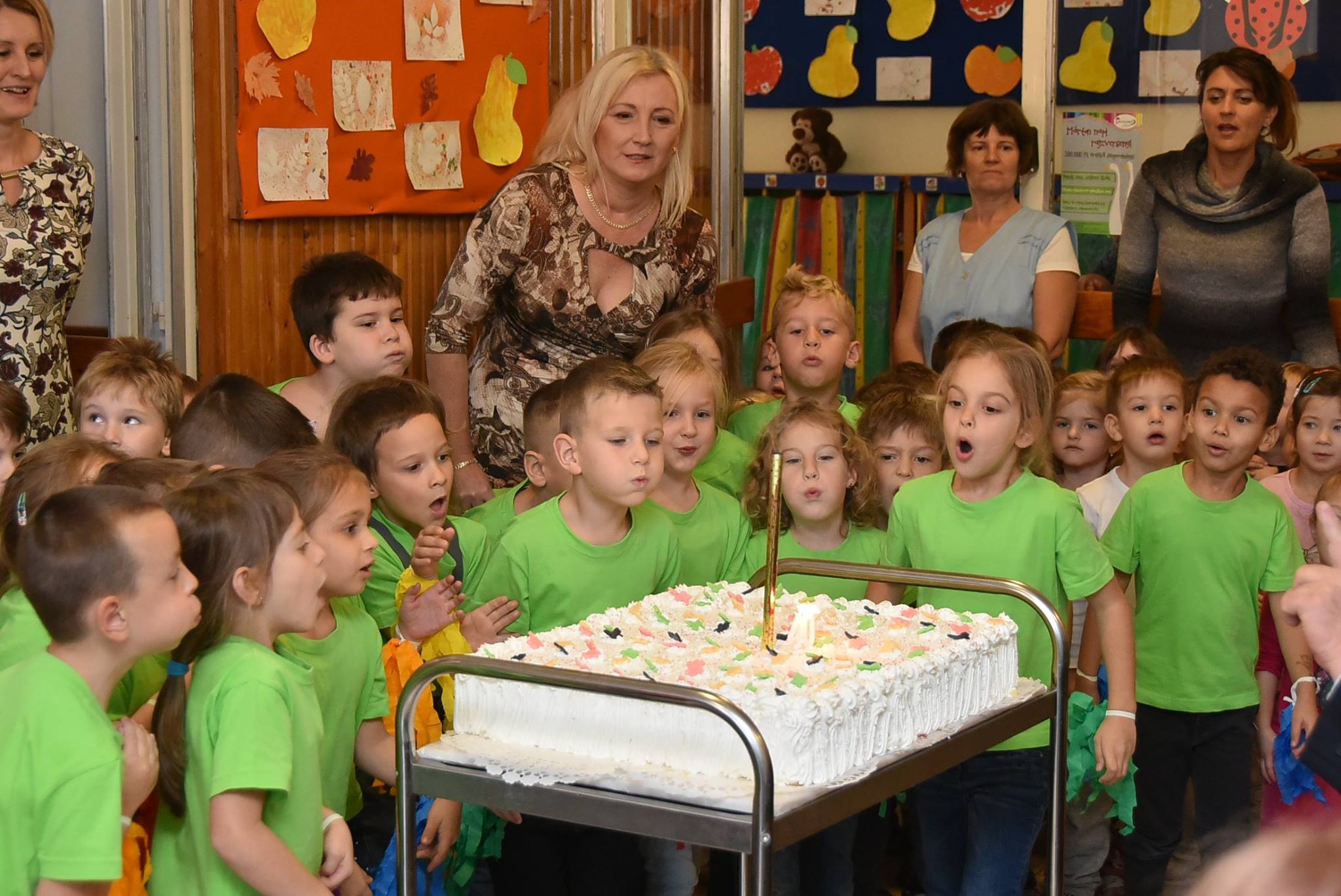 Az óvodások műsorával indult a buli, majd szép lassan begurult az ünnepi torta. Amíg a kicsik tortáztak, addig a vendégek egy kisfilmet tekinthettek meg az óvoda mai hétköznapi életéből.