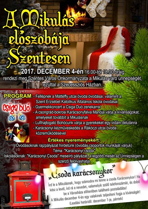 2017. december 4-én 16.00 órától 18.00 óráig rendezi meg Szentes Város Önkormányzata a Mikulás váró ünnepségét, ezúttal a Szecessziós Házban.