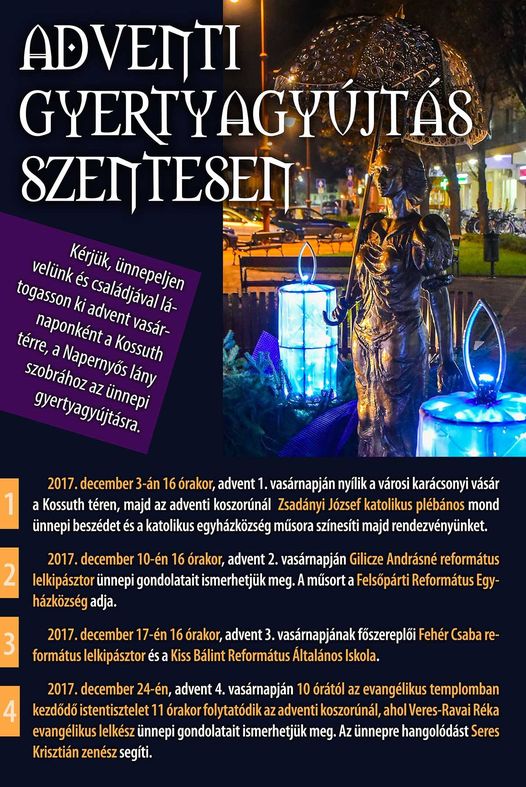 A város hagyományaihoz híven 2017-ben is felállításra kerül a városi adventi koszorú. Kérjük, ünnepeljen velünk, és családjával látogasson ki advent vasárnapjain 16 órakor a Kossuth téri ünnepi gyertyagyújtásra.