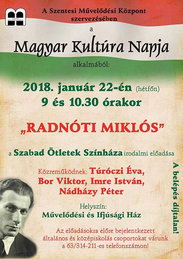 Ebben az évben a Szentesi Művelődési Központ több programmal emlékezik meg a Magyar Kultúra Napjáról. 2018. január 22-én 9:00 és 10:30-kor „Radnóti Miklós” címmel a Szabad Ötletek Színházának irodalmi előadását tekinthetjük meg a Művelődési és Ifjúsági házban. Az előadásokra előre bejelentkezett általános és középiskolás csoportokat várnak.