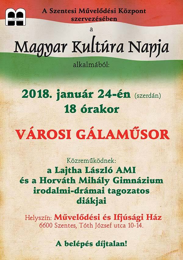 2018. január 24-én szerdán 18:00 órakor Városi Gálaműsort rendeznek az ifjúsági ház pódium termében. Közreműködnek a Lajtha László Alapfokú Művészeti Iskola és a Horváth Mihály Gimnázium irodalmi drámai tagozatának diákjai. A belépés díjtalan.