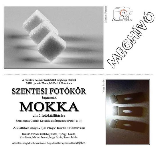 A Szentesi Fotókör tisztelettel meghívja Önöket 2018. január 22-én, hétfőn 18.00 órára a Szentesi Fotókör tagjainak MOKKA című kiállítására Szentesen a Galéria Kávéház és Étterembe (Petőfi u. 7.)