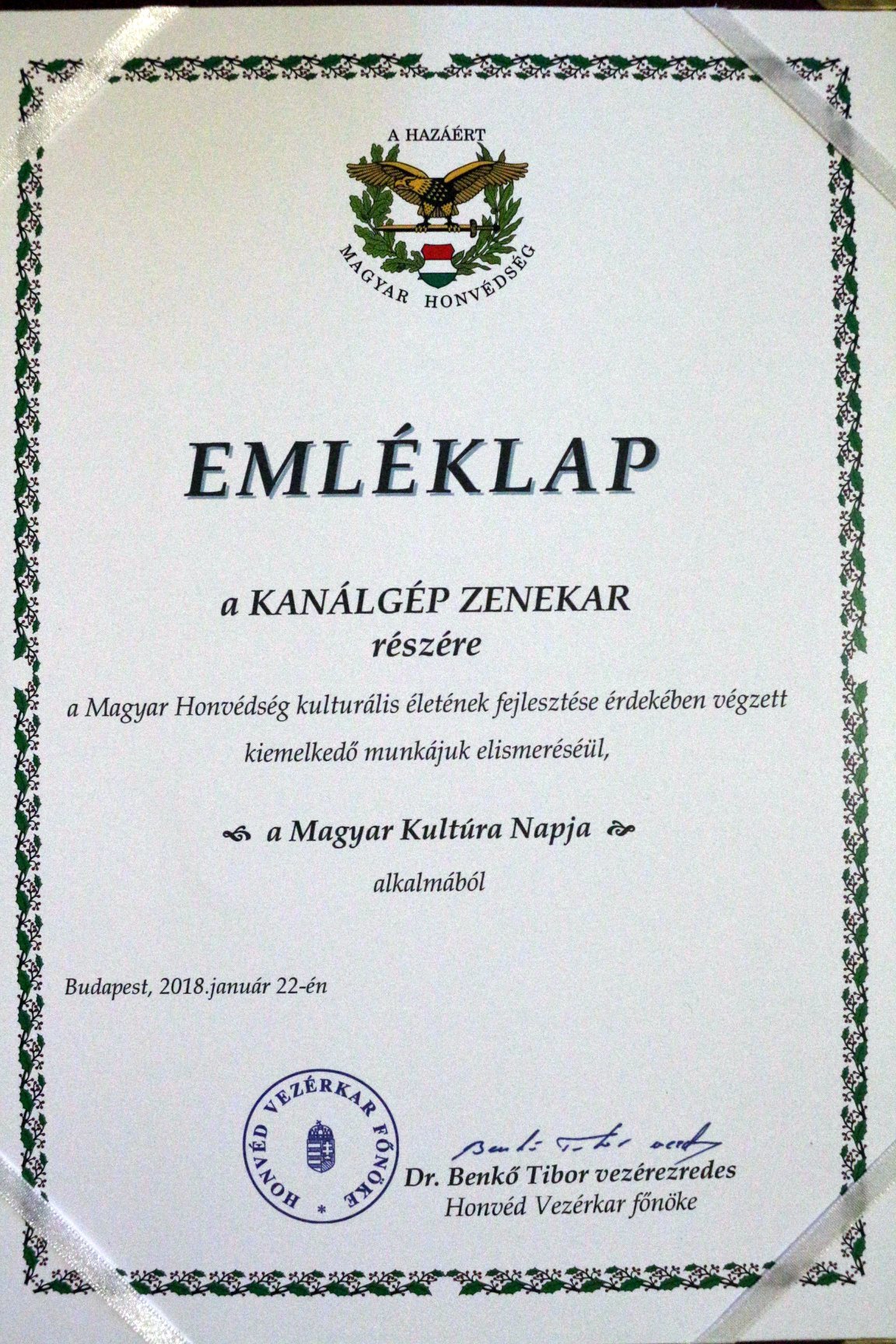 Dr. Benkő Tibor vezérezredes, a Honvéd Vezérkar főnöke a Magyar Kultúra Napja alkalmából emléklapot adományozott a Magyar Honvédség kulturális életének fejlesztése érdekében végzett kiemelkedő munkájuk elismeréséül a Kanálgép zenekarnak.