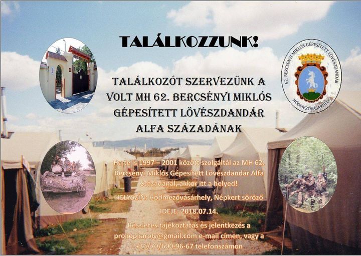 Közzétesszük ezt a plakátot, hogy tájékoztassuk a volt MH 62. Bercsényi Miklós Gépesített Lövészdandár Alfa Század állományát a talkálkozóról.