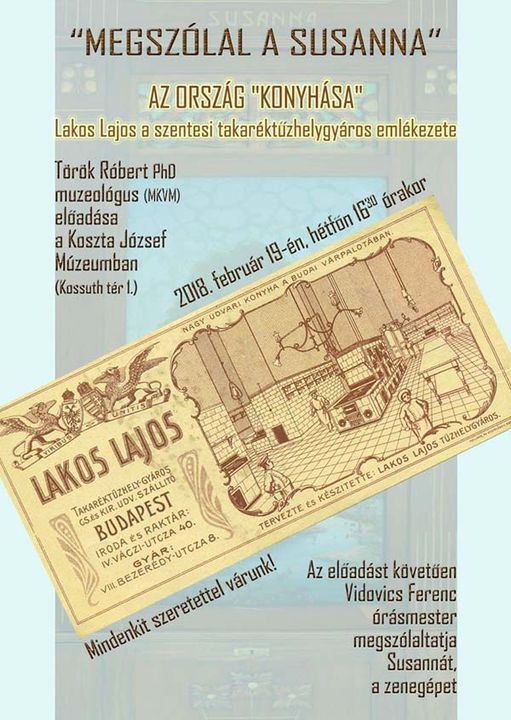 „Az ország konyhása” címmel Török Róbert muzeológus előadását hallhatjuk 2018. február 19-én hétfőn 16:30 kezdettel a Koszta József múzeumban. Előadásával emlékezik vissza Lakos Lajos szentesi takaréktűzhelygyárosra, majd ezt követően ismételten megszólal Susanna zenegép. A gépet elindítja Vidovics Ferenc órásmester. Mindenkit szeretettel várnak!