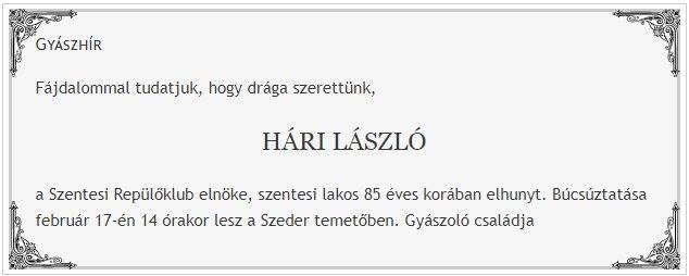 Hári László műszerész és feltaláló, a repülés iránt elkötelezett sportember 85 éves korában az utolsó felszállására indult a felhők közé. Búcsúztatása február 17-én 14 órakor lesz a Szeder temetőben.