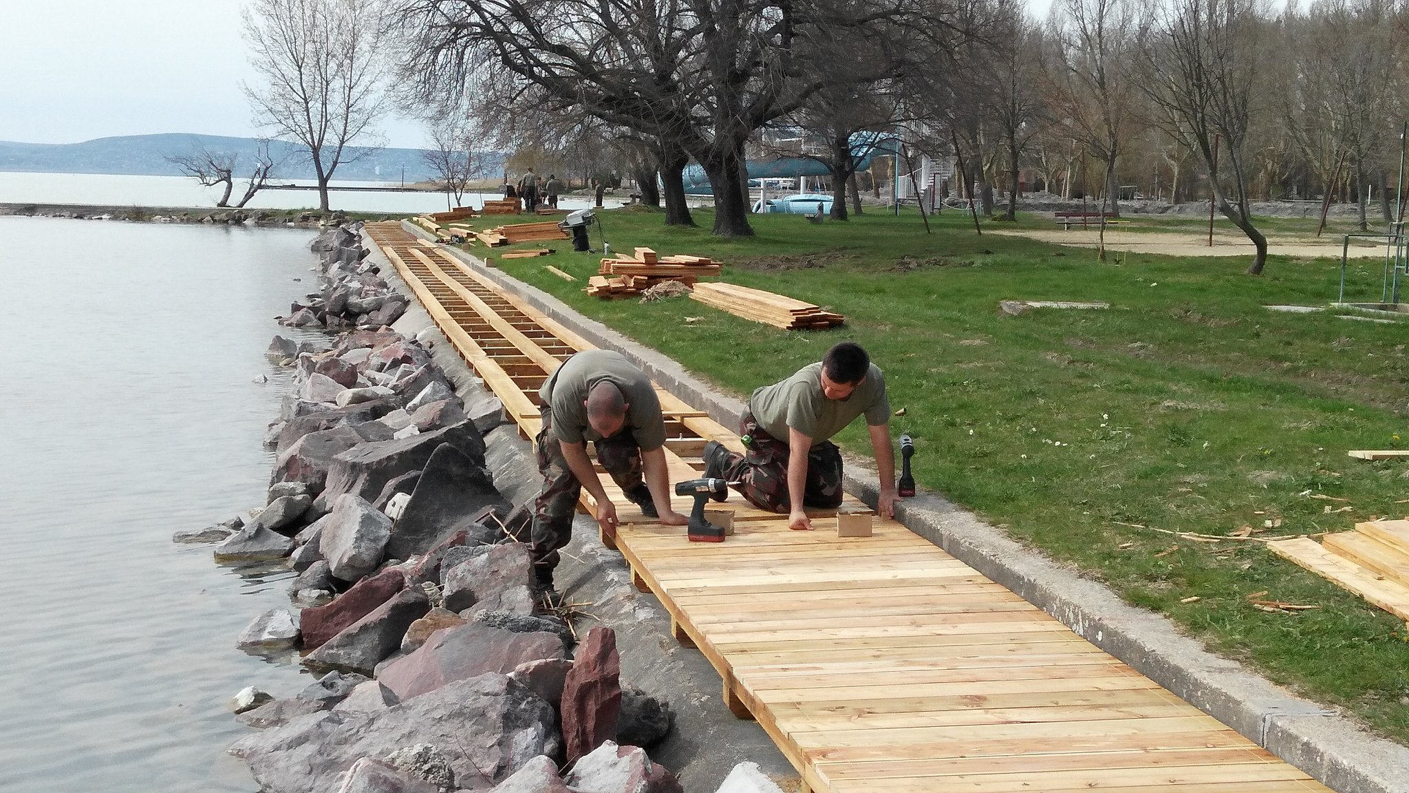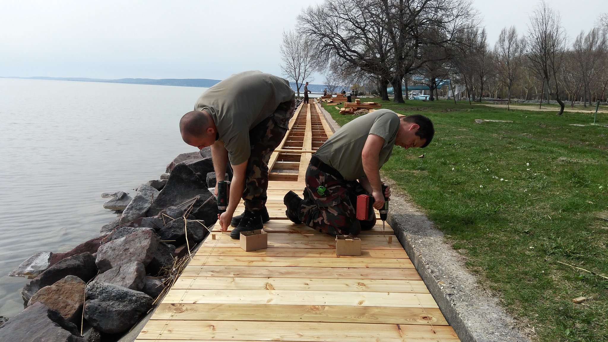 A műszaki ezred Alacsonyvízi Hídépítő századának katonái Balatonakarattyán, az MH Rekreációs, Kiképzési és Konferencia Központban dolgoznak. Feladatuk a honvédüdülő parti védművének fával történő burkolása, csúszásmentesítése.