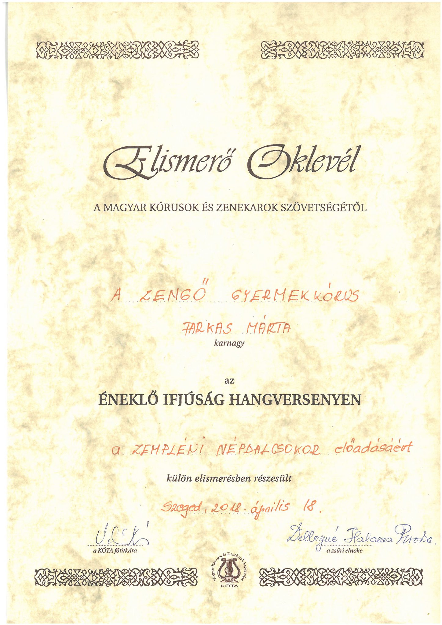 A Kiss Bálint Református Általános Iskola gyermekkórusa az április 18-án Szegeden lezajlott minősítő hangversenyen ARANY minősítést szerzett! A kórus elismerő oklevelet kapott a Zempléni népdalcsokor előadásáért és meghívást kapott a május 3-i Gála hangversenyre, amely Szegeden az SZTE Zeneművészeti Karán kerül megrendezésre. Gratulálunk a kórus tagjainak!