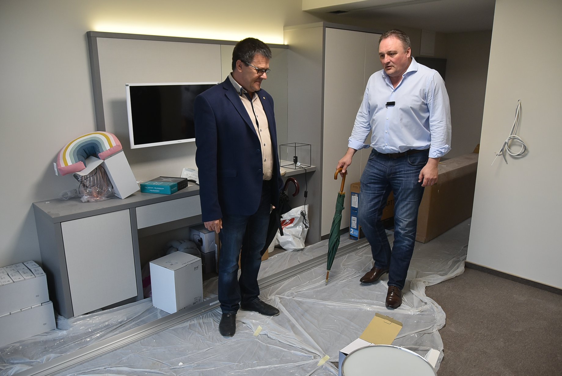 Akik az épület előtt elmennek keveset látnak a belső munkálatokból. Ezen a héten fejeződik be a szobák kivitelezése. A berendezési tárgyak is megvannak. A térburkolatok kerülnek a legvégén a helyükre. Nyílászárók közül is már csak egy üvegfalat kell beépíteni, amelynek darabjai 300 kg-osak, így állványzatot kell építeni a behelyezéshez, de ez is pár napon belül megtörténik.