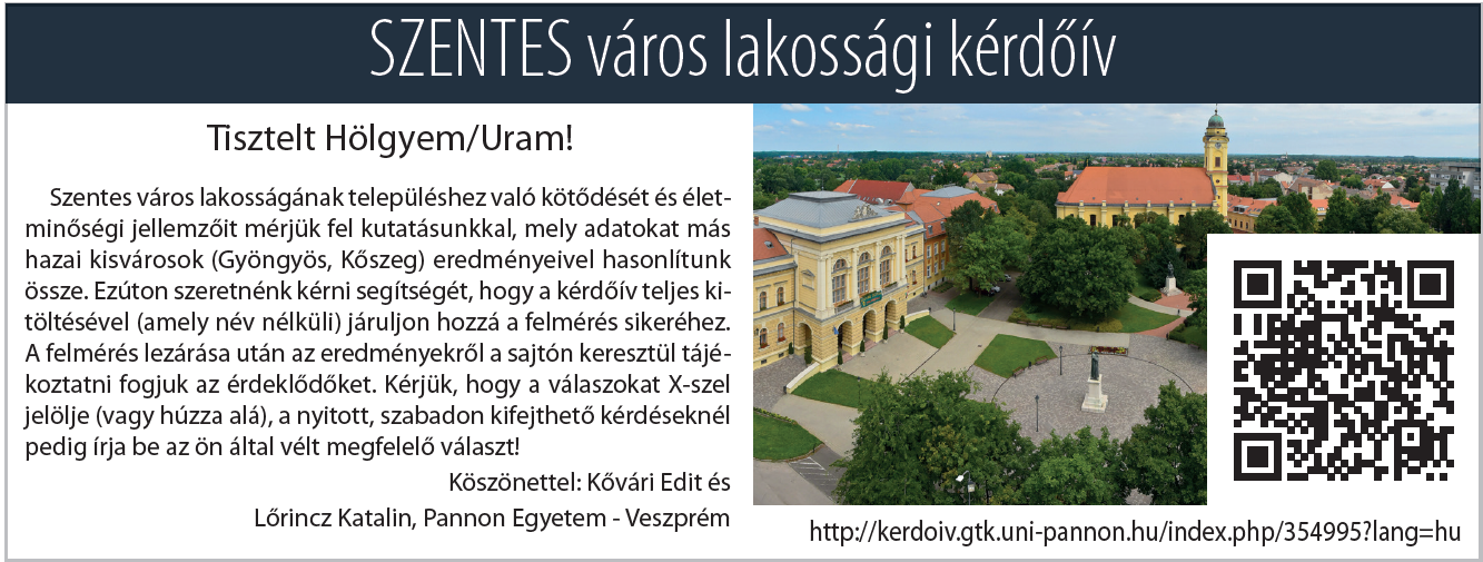 Tisztelt Hölgyem/Uram! Szentes város lakosságának településhez való kötődését és életminőségi jellemzőit mérjük fel kutatásunkkal, mely adatokat más hazai kisvárosok (Gyöngyös, Kőszeg) eredményeivel hasonlítunk össze. Ezúton szeretnénk kérni segítségét, hogy a kérdőív teljes kitöltésével (amely név nélküli) járuljon hozzá a felmérés sikeréhez. A felmérés lezárása után az eredményekről a sajtón keresztül tájékoztatni fogjuk az érdeklődőket. Kérjük, hogy a válaszokat X-szel jelölje (vagy húzza alá), a nyitott, szabadon kifejthető kérdéseknél pedig írja be az ön által vélt megfelelő választ!
