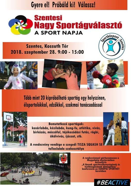 2018. szeptember 28-án rendezik meg a Szentesi Nagy Sportágválasztót. Több mint 20 kipróbálható sportág egy helyszínen élsportolókkal, edzőkkel, szakmai tanácsadással a Szentesen a Kossuth téren.