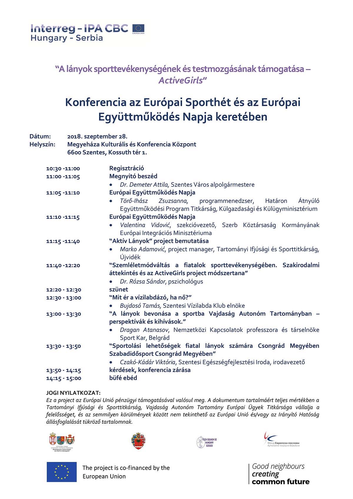 A lányok sporttevékenységének és testmozgásának támogatása – ActiveGirls” című projekt keretében tartanak konferenciát szeptember 28-án, pénteken a Megyeháza Kulturális és Konferencia Központban. Az eseményre az Interreg – IPA Szerbia – Magyarország határon átívelő együttműködési program révén az Európai Unió által társfinanszírozott, az az Európai Együttműködés Napja programsorozattal együttműködésben kerül sor.