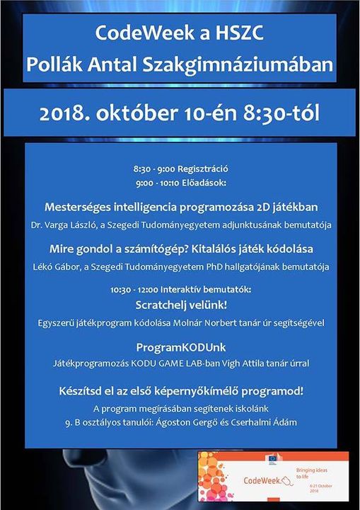 A HSZC Pollák Antal Szakgimnáziuma és Szakközépiskolájában 2018. október 10-én 9 órától megrendezésre kerül a CodeWeek 2018. című rendezvénye.