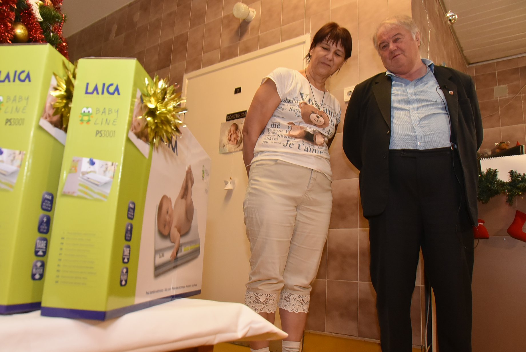 Két csecsemő mérleggel érkezett az osztályra, ahol Dr. Tóth Edit főorvosnak adta át a készülékeket és a kabinet iroda által gyűjtött ajándékokat.