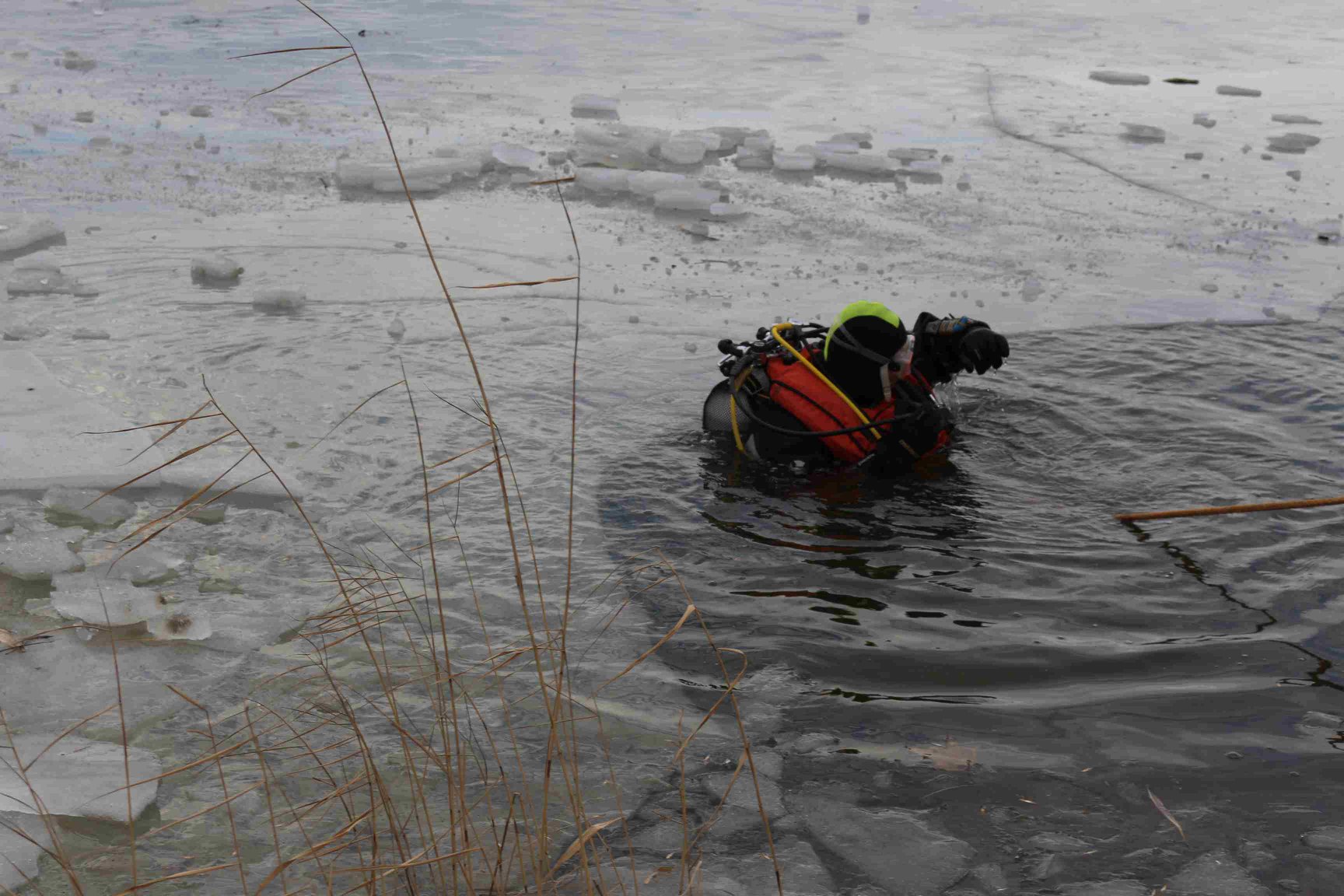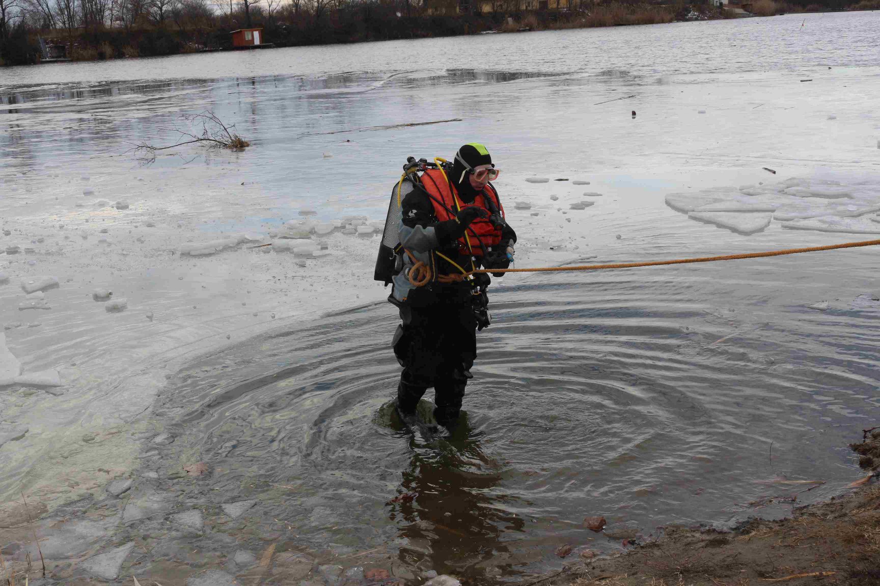 Szőnyi Kornél őrmester, merülésvezető ismertette a feladatot, majd külön felhívta a figyelmet az esetleges veszélyforrásokra. A jeges vízbe egyszerre ketten merültek, a merülőket pedig társaik a partról kötéllel biztosították és kötéljelzésekkel irányították. „Most azt gyakoroljuk, hogy egy búvár bajba jutott a befagyott vízben, elvesztette a tájékozódó képességét és leoldódott a kötele. Megáll és függőlegesen tartózkodik a jég alatt” – ismerteti a szituációt a merülésvezető, aki ilyenkor rendfokozattól függetlenül a munkahelyi parancsnok is a búvároknál. A keresőbúvár társa megmentésére dupla hosszú biztosítókötéllel indul a jég alá, abba az irányba, amerre társa tartózkodhat. A minimálisra csökkent látási viszonyok miatt az úszókötél biztosítja számukra az egymás közti kapcsolatot.