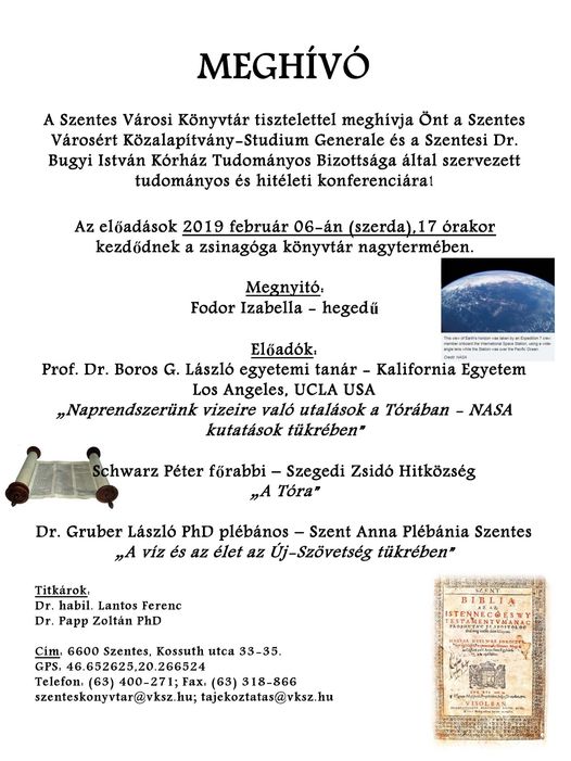 A Szentes Városi Könyvtár tisztelettel meghívja Önt a Szentes Városért Közalapítvány-Studium Generale és a Szentesi Dr. Bugyi István Kórház Tudományos Bizottsága által szervezett tudományos és hitéleti konferenciájára!