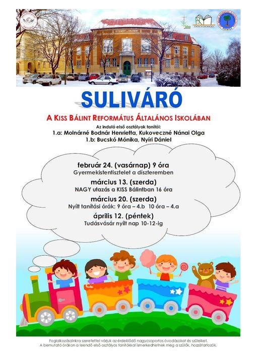 A Kiss Bálint Református Általános Iskolában suliváró programokat tartanak 2019. február 24-től az első osztályba készülő gyermekek és szüleik számára. A további programokról az alábbi plakátról tájékozódhat!