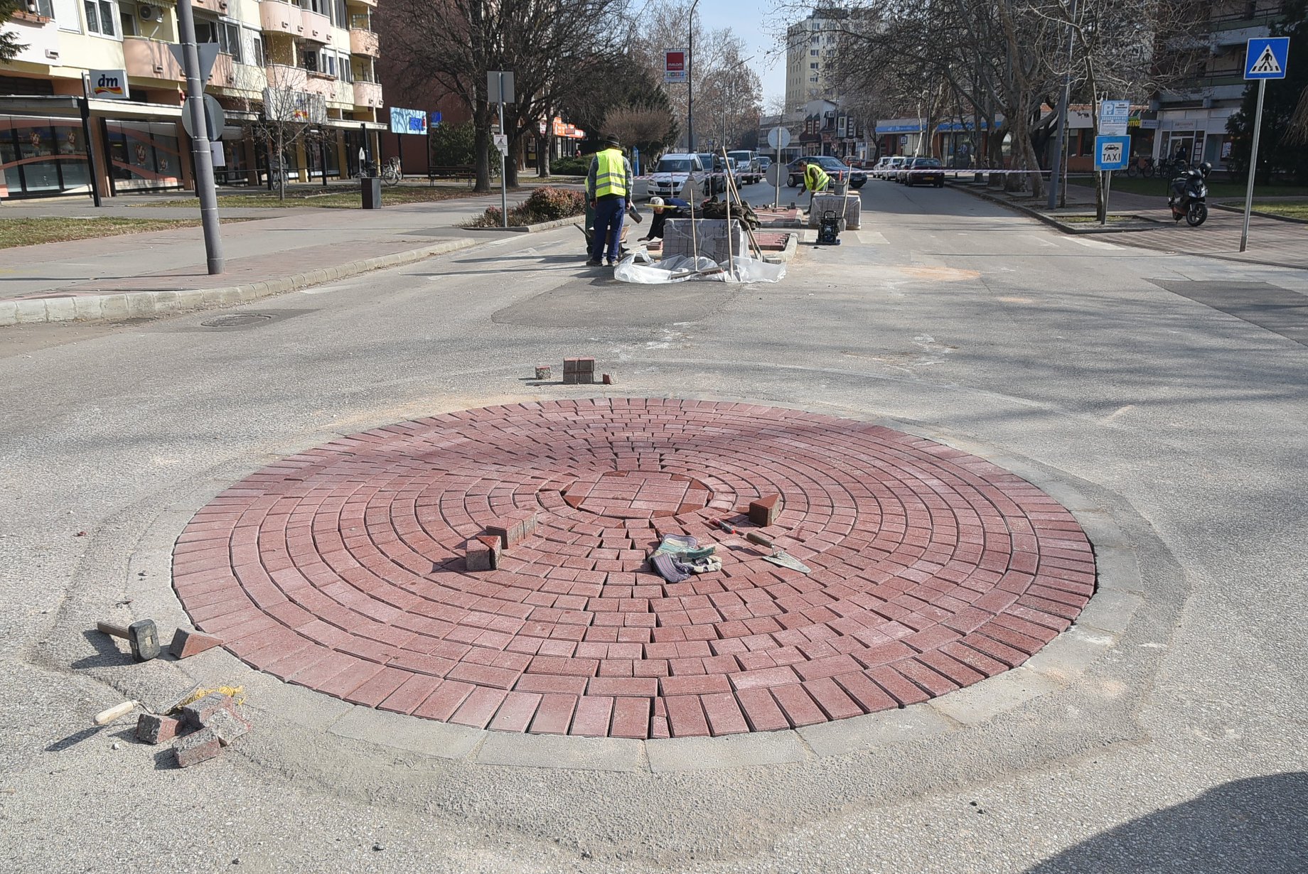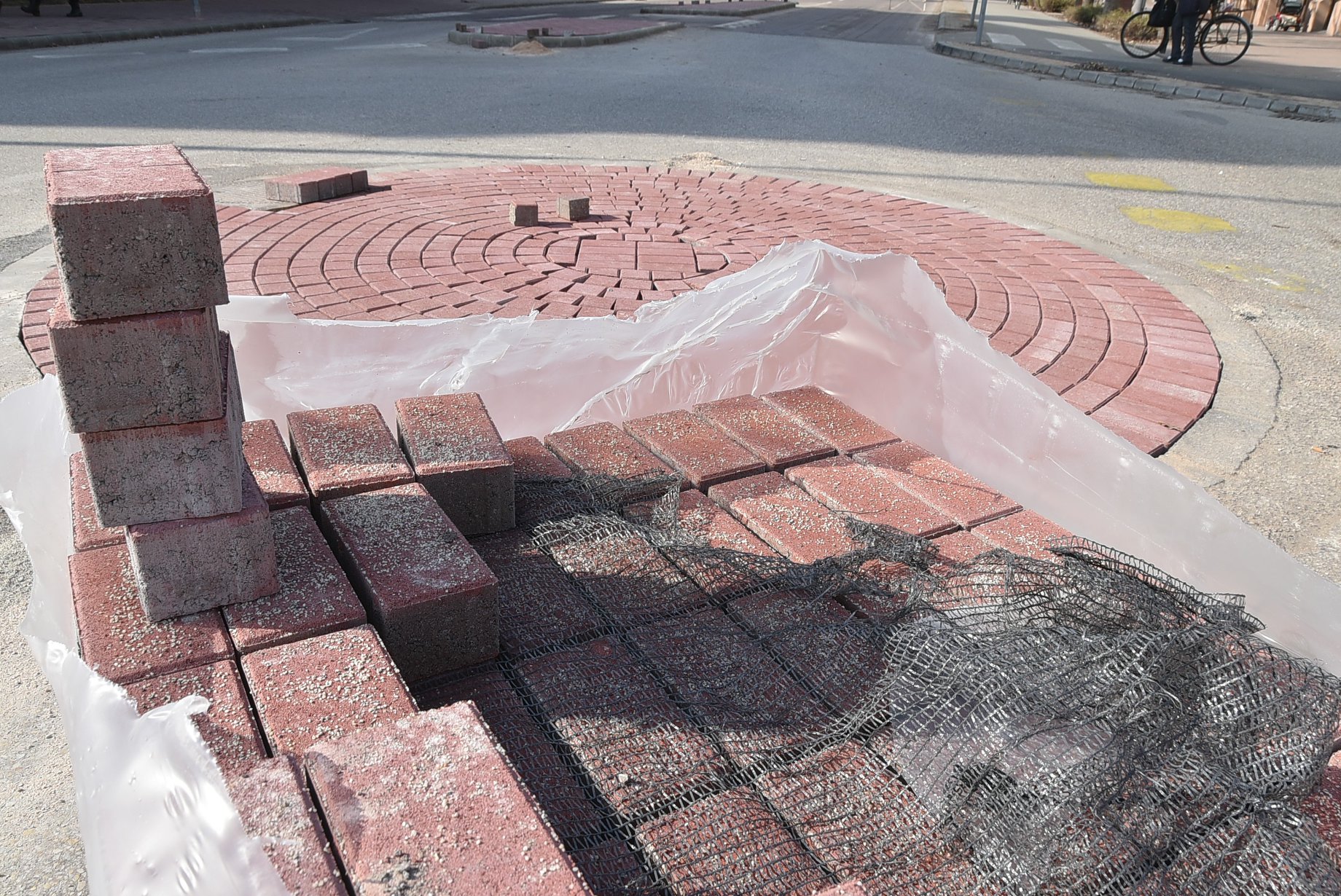 Már csak az utolsó simítások vannak hátra a kettős mini körforgalomban! A térburkolók a helyükön és a tegnapi napon elkészült a körforgalmak útburkolati jeleinek festése is.