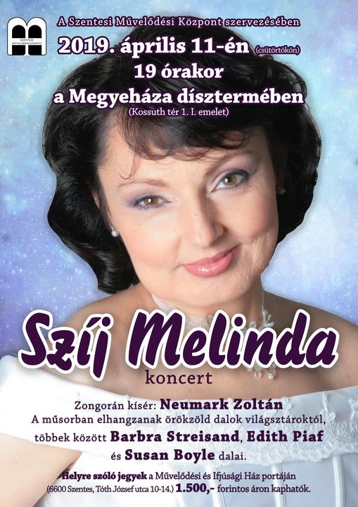 2019. április 11-én a Megyeháza Konferencia és Kulturális Központban Szíj Melinda koncertjére várunk mindenkit szeretettel!
