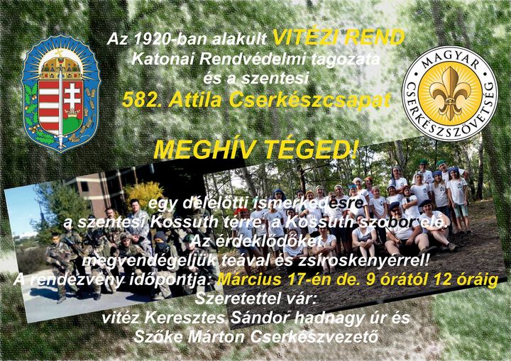 Az 1920-ban alakult VITÉZI REND Katonai Rendvédelmi tagozata és a szentesi 582. Attila Cserkészcsapat MEGHÍV TÉGED egy délelőtti ismerkedésre a szentesi Kossuth térre, a Kossuth szobor elé.