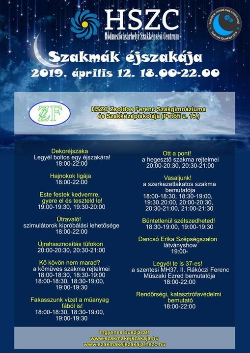 2019. április 12-én Téged is vár a HSZC Zsoldos Ferenc Szakgimnáziuma és Szakközépiskolája 18 és 22 óra között, ahol sok-sok szakmával megismerkedhetsz és ki is próbálhatod benne magad!