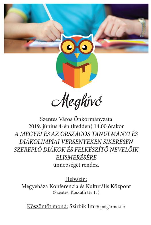 Szentes Város Önkormányzata 2019. június 4-én (kedden) 14.00 órakor A MEGYEI ÉS AZ ORSZÁGOS TANULMÁNYI ÉS DIÁKOLIMPIAI VERSENYEKEN SIKERESEN SZEREPLŐ DIÁKOK ÉS FELKÉSZÍTŐ NEVELŐIK ELISMERÉSÉRE ünnepséget rendez.
