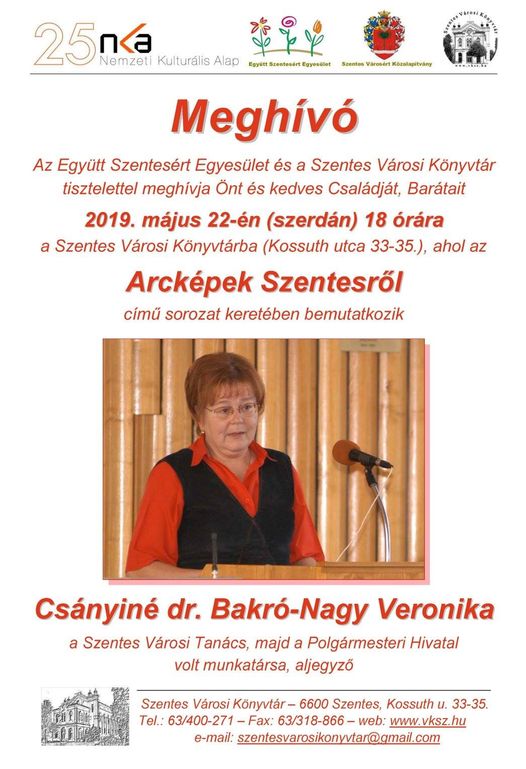 Az Együtt Szentesért Egyesület és a Szentes Városi Könyvtár tisztelettel meghívja Önt és kedves Családját, Barátait 2019. május 22-én (szerdán) 18 órára a Szentes Városi Könyvtárba (Kossuth utca 33-35.), ahol az Arcképek Szentesről című sorozat keretében bemutatkozik Csányiné dr. Bakró-Nagy Veronika a Szentes Városi Tanács, majd a Polgármesteri Hivatal volt munkatársa, aljegyző.
