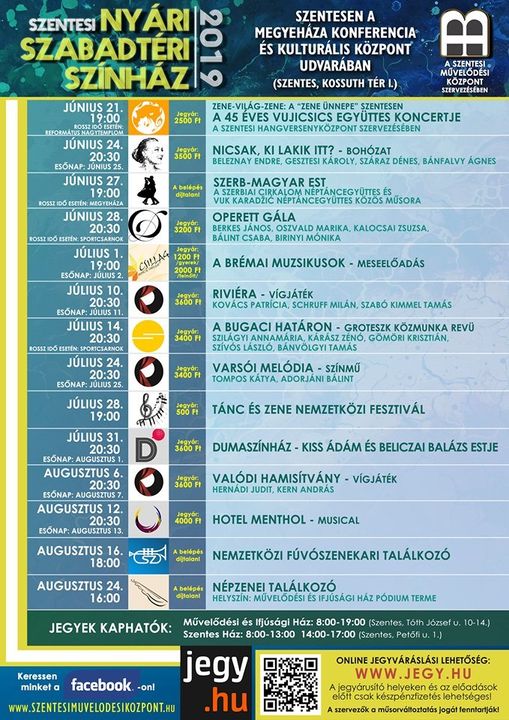 A Szentesi Művelődési Központ Szabadtéri Színházának előadásaira jegyek már kaphatóak a Művelődési és Ifjúsági Házban (Tóth J. utca 10-14), a Szentes Házban (Petőfi u. 1) és online is a Jegy.hu portálon.