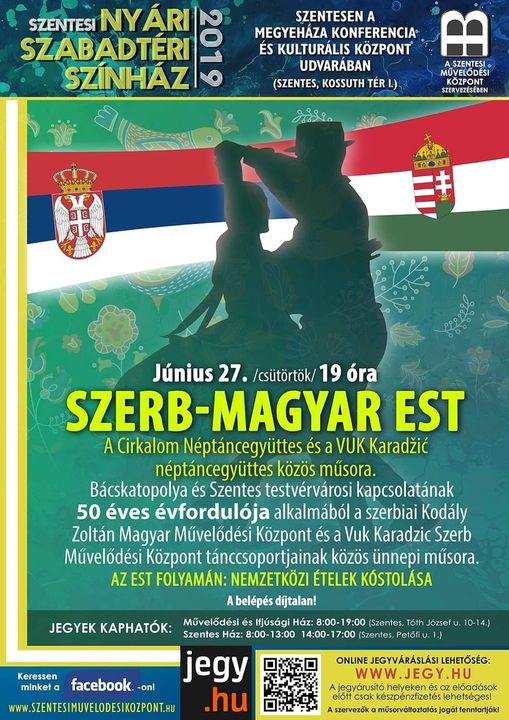 Topolya és Szentes testvérvárosi kapcsolatának 50 éves évfordulója alkalmából a szerbiai Kodály Zoltán Magyar Művelődési Központ és a Vuk Karadzic Szerb Művelődési Központ tánccsoportjainak közös ünnepi műsora.