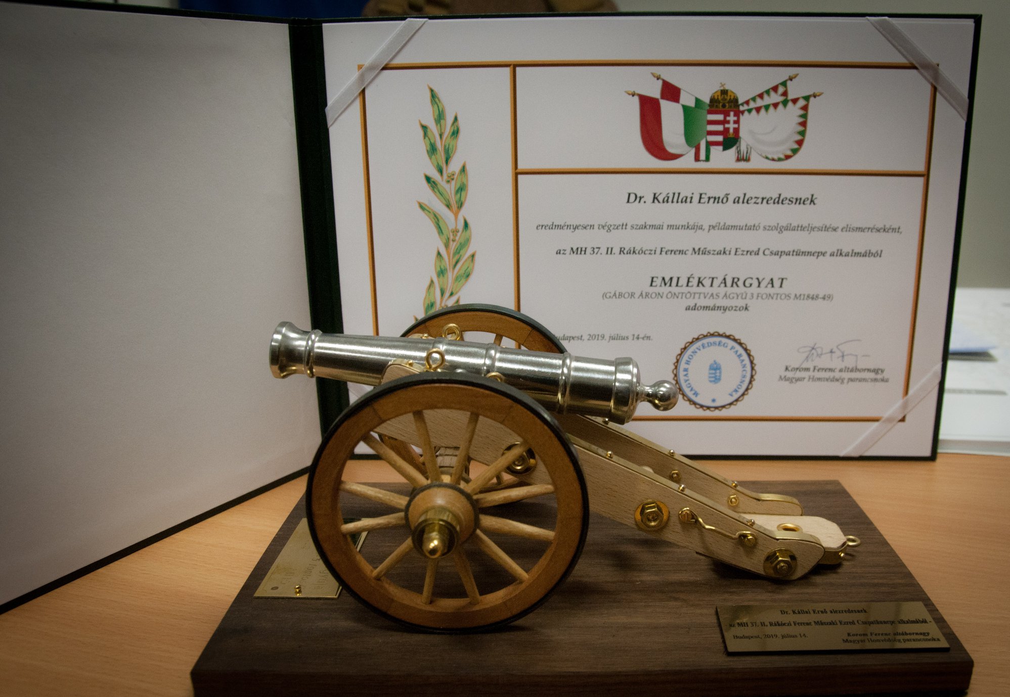 A Magyar Honvédség Parancsnoka, Korom Ferenc altábornagy eredményesen végzett szakmai munkája, példamutató szolgálatteljesítése elismeréseként az MH 37. II. Rákóczi Ferenc Műszaki Ezred Csapatünnepe alkalmából emléktárgyat adományozott Dr. Kállai Ernő alezredesnek.
