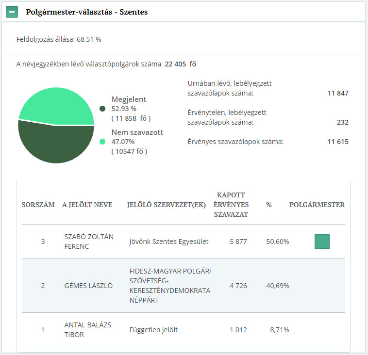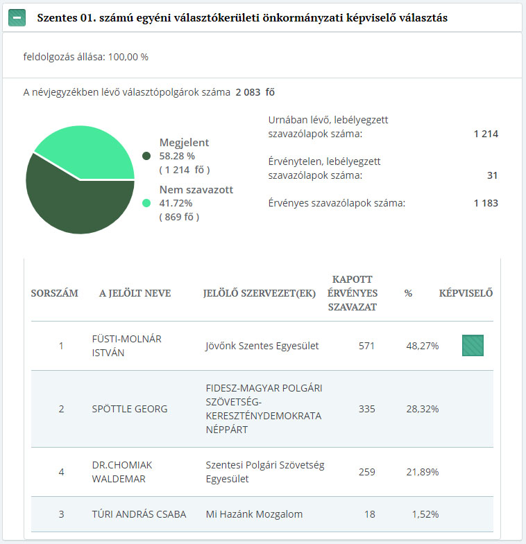 Az alábbi képeken tekinthetjük meg a választókerületi eredményeket! Tíz körzetben a JÖSZ-ös (Jövőnk Szentes Egyesület) jelöltjei nyertek, így ők jutottak be egyéniben, a töredékszavazatok alapján 3 Fidesz-es képviselője és egy SzPSzE jelölt foglal helyet az új testületben.