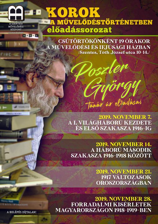 A Szentesi Művelődési Központ szeretettel vár minden történelem és irodalom után érdeklődőt az Ifjúsági Ház klubjába csütörtökönként 19 órakor Poszler György Tanár úr előadásaira.