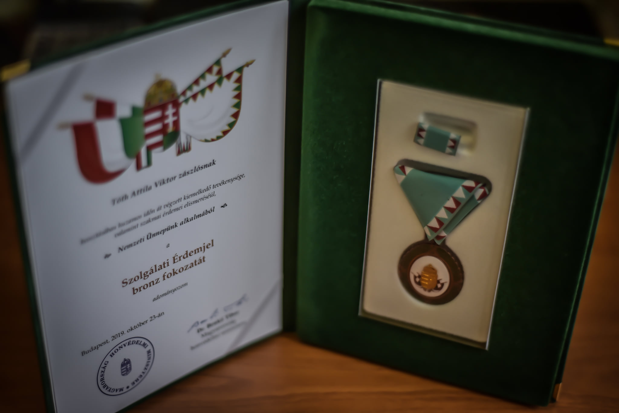 Magyarország honvédelmi minisztere a Szolgálati Érdemjel bronz fokozatát adományozta Nemzeti Ünnepünk, október 23-a alkalmából beosztásában huzamos időn át végzett kiemelkedő tevékenysége, valamint szakmai érdemei elismeréséül TÓTH ATTILA VIKTOR zászlósnak