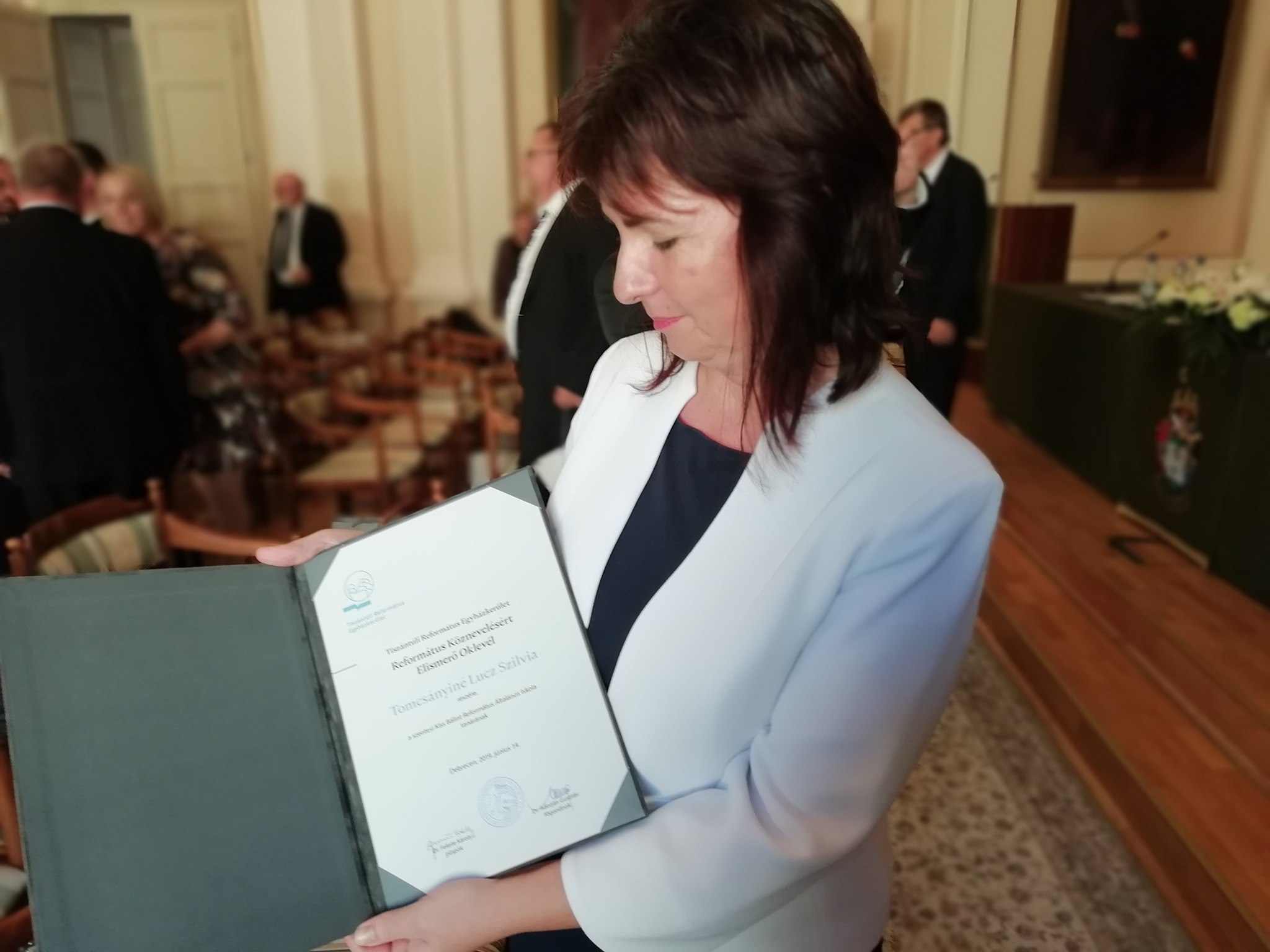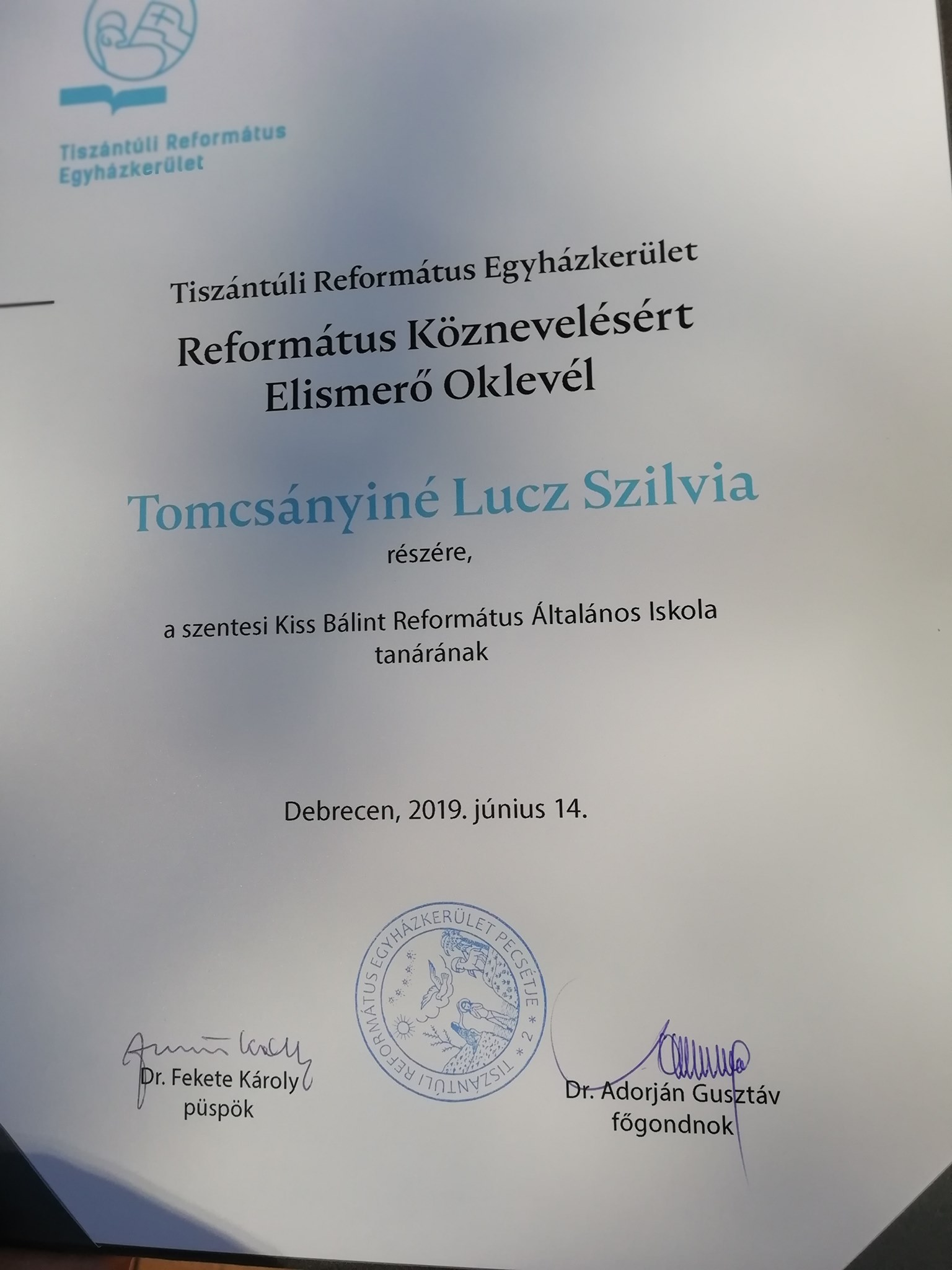 Tomcsányiné Lucz Szilvia, a Kiss Bálint Református Általános Iskola magyar-történelem szakos tanárnője október 25-én, a Tiszántúli Református Egyházkerület közgyűlésén Református Köznevelésért Elismerő Oklevelet vehetett át. Gratulálunk!